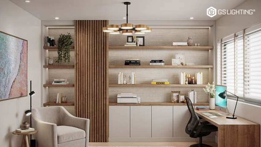 Ngoài ra, có thể kết hợp đèn spotlight đôi chỉnh hướng để tập trung ánh sáng tại bàn làm việc, kệ sách hoặc khu vực lưu trữ, đảm bảo hiệu quả làm việc mà vẫn giữ được phong cách trang nhã, tối giản.