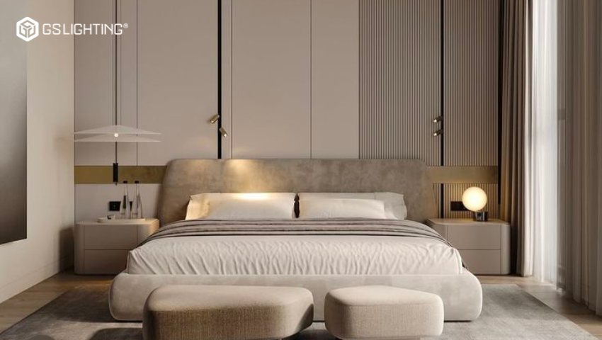 Bên cạnh đó, bạn có thể bố trí đèn spotlight mini tại các vị trí đầu giường hoặc bàn trang điểm để tạo thêm điểm nhấn ấm áp mà không gây chói mắt.