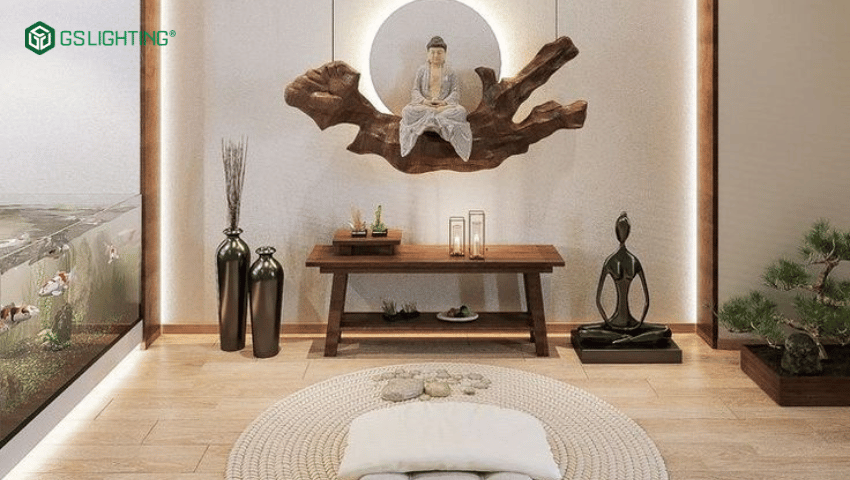 Ánh sáng nền: Sử dụng đèn âm trần hoặc đèn thả nhẹ nhàng để tạo không gian dịu mát, tôn nghiêm.
