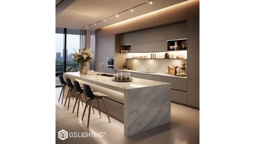 Gợi ý phối hợp: Dùng spotlight kết hợp với đèn LED dây âm tủ hoặc đèn thả trần để tạo chiều sâu và lớp ánh sáng phong phú.