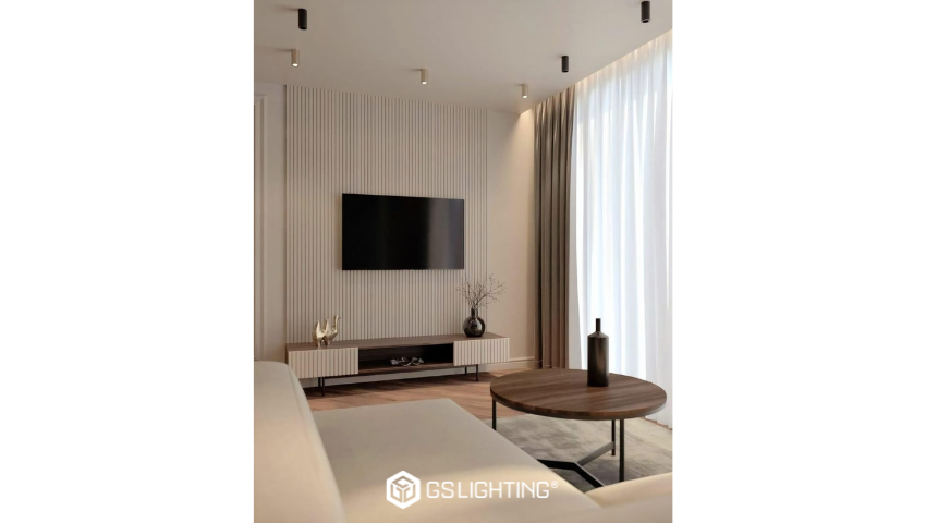 Kết hợp ánh sáng tổng thể và điểm nhấn để làm nổi bật bàn trà, kệ tivi hoặc tranh treo tường.