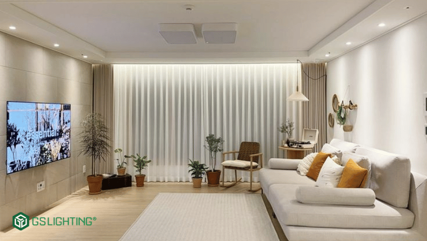 Phòng lớn trên 20m² như phòng khách: nên kết hợp nhiều đèn downlight không viền hoặc đèn spotlight đôi chỉnh hướng để đảm bảo ánh sáng đủ mạnh và đều khắp không gian.