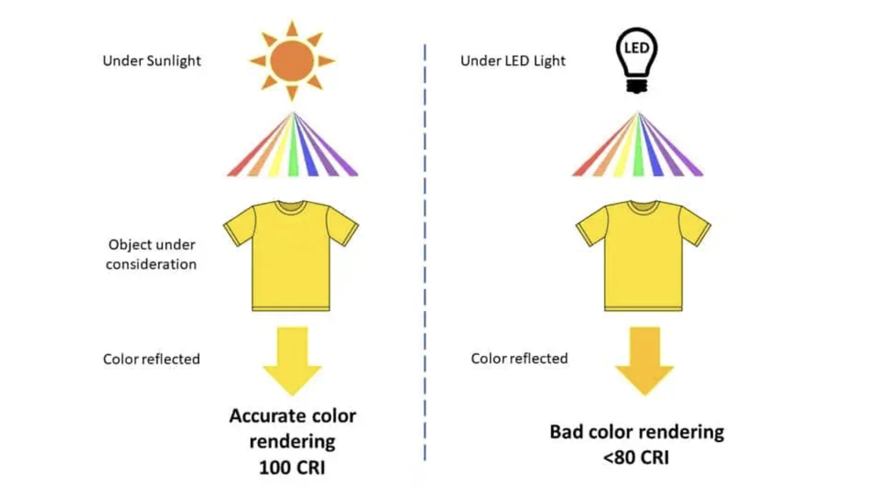 CRI so sánh cách một vật thể hiển thị màu sắc dưới ánh sáng nhân tạo với ánh sáng mặt trời – tiêu chuẩn được xem là hoàn hảo (CRI = 100). Nếu ánh sáng nhân tạo giúp vật thể hiển thị màu giống như dưới ánh sáng tự nhiên, thì CRI của nguồn sáng đó được xem là cao. Ngược lại, CRI thấp khiến màu sắc bị sai lệch, mờ nhạt hoặc méo mó.