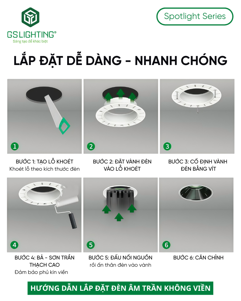 Bên cạnh các phương án lắp đặt tiêu chuẩn, đèn GS Lighting còn có thêm tùy chọn vành âm trần thạch cao, phù hợp với các thiết kế trần âm mang tính thẩm mỹ cao.