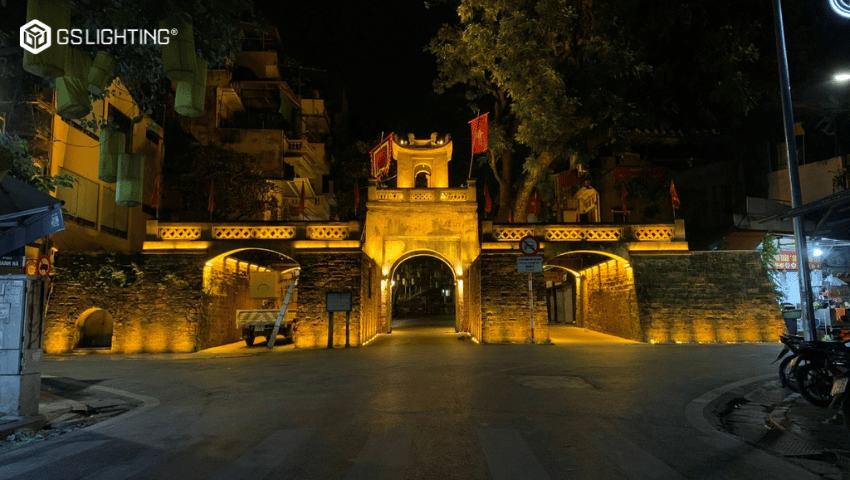 Bên cạnh đó, đèn âm đất vuông được bố trí quanh chân tường, chiếu ánh sáng từ dưới lên. Với khả năng chịu lực, chống bụi và nước cao, đèn âm đất vuông không chỉ đảm bảo độ bền vượt trội dưới điều kiện ngoài trời mà còn tạo nên hiệu ứng chiếu ngược, khiến Ô Quan Chưởng càng thêm phần bề thế và trang nghiêm khi đêm xuống.