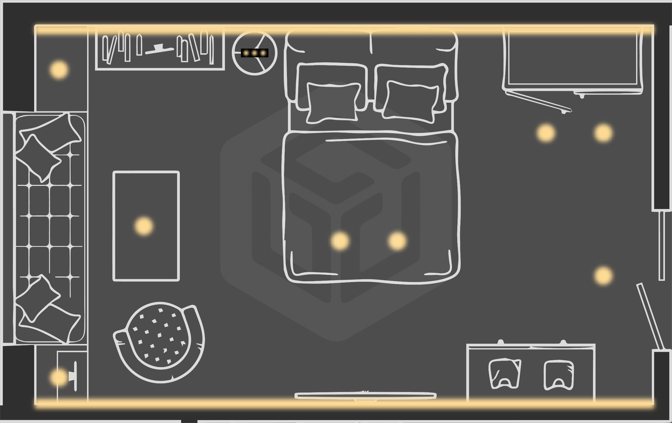 • Giải pháp: Sử dụng đèn âm trần với công suất thấp và nhiệt độ màu ấm (2700K - 3000K) để tạo ánh sáng nền nhẹ nhàng. Ngoài ra, đèn bàn hoặc đèn ngủ cạnh giường cũng nên có ánh sáng vàng dịu để tạo cảm giác ấm cúng.