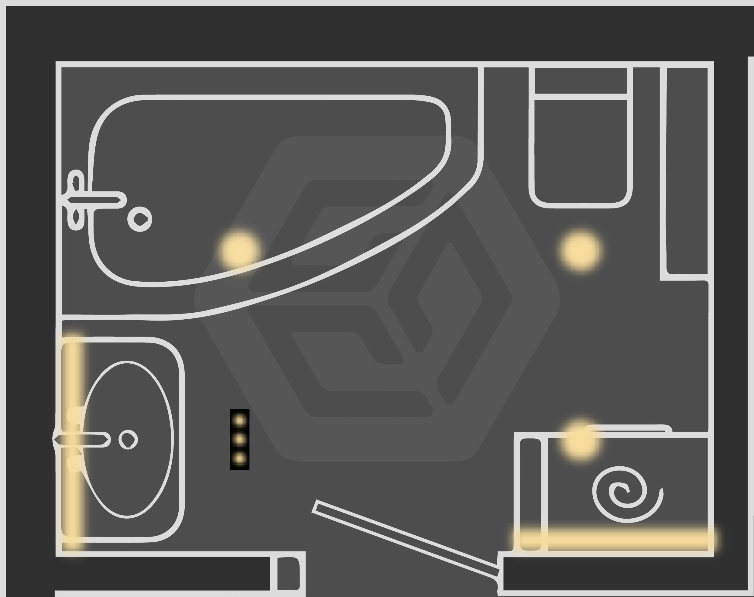 • Tips: Nếu muốn tạo không gian thư giãn trong phòng tắm, bạn có thể sử dụng thêm đèn hắt với ánh sáng vàng nhẹ (2700K) quanh bồn tắm hoặc khu vực ngồi.