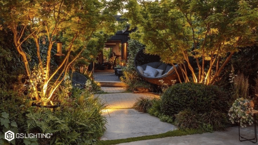 Đèn LED âm đất để chiếu hắt lên cột, tường hoặc cây – tạo hiệu ứng khối và chiều cao.