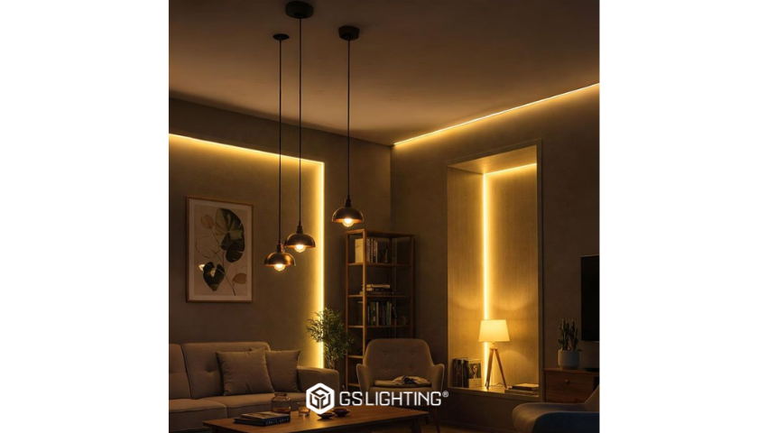 Trong phòng khách, ánh sáng từ đèn thả hay đèn linear tạo nên sự sang trọng và ấm áp.