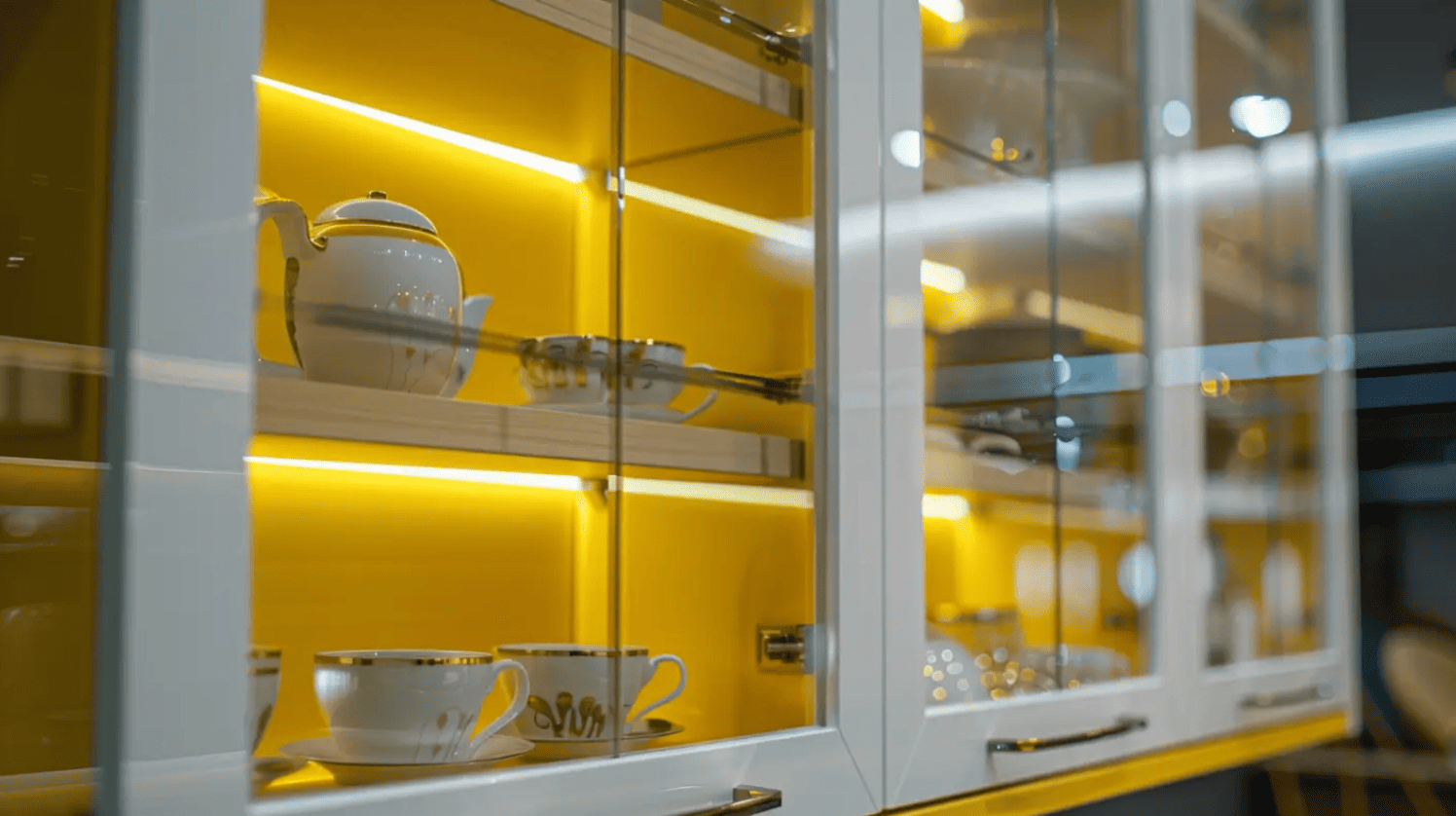 Nếu bạn sở hữu tủ bếp có cửa kính hoặc dùng để trưng bày bát đĩa, ly cốc cao cấp, hãy tận dụng ngay cơ hội để lắp đèn LED bên trong. Ánh sáng mềm mại phát ra từ các ngăn tủ không chỉ làm nổi bật vật dụng mà còn mang lại cảm giác cao cấp, sang trọng và hiện đại. Đặc biệt vào ban đêm, bạn sẽ cảm nhận rõ sự khác biệt về không khí mà ánh sáng dịu nhẹ này mang lại.