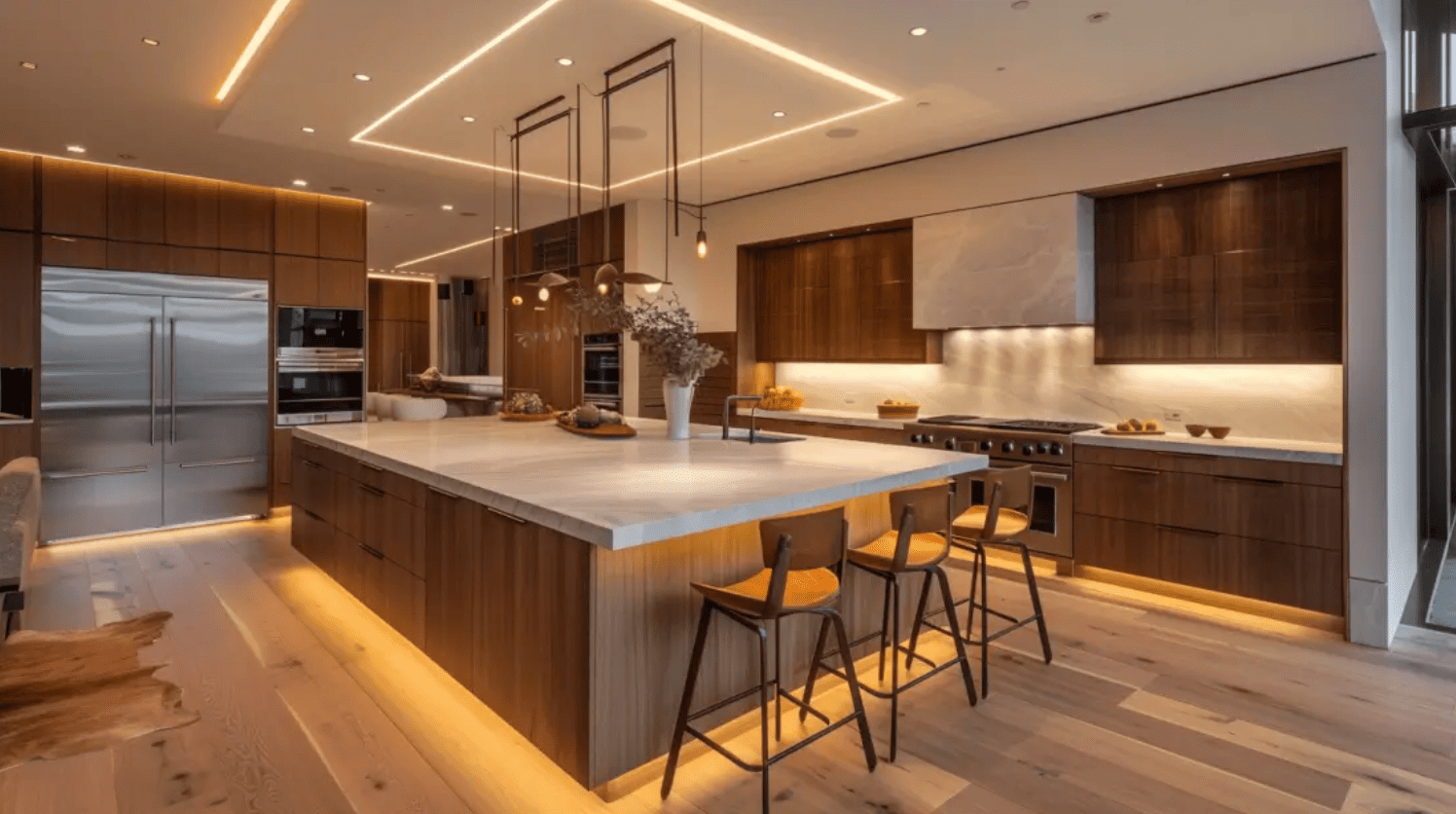 5. Lắp Đèn LED Dọc Theo Chu Vi Sàn Bếp – Lung Linh Từng Chi Tiết